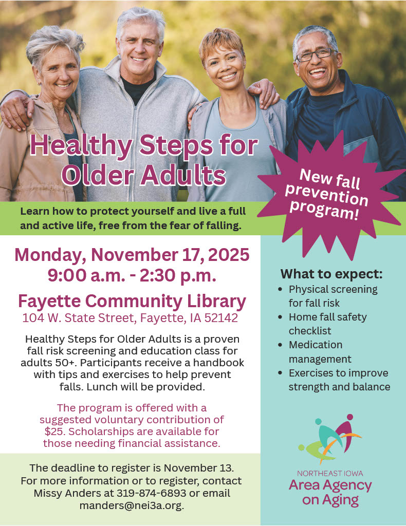 To help address this issue, Northeast Iowa Area Agency on Aging (NEI3A) is offering Healthy Steps for Older Adults (HSOA), an evidence-based fall risk screening and education program designed for adults age 50 and older.