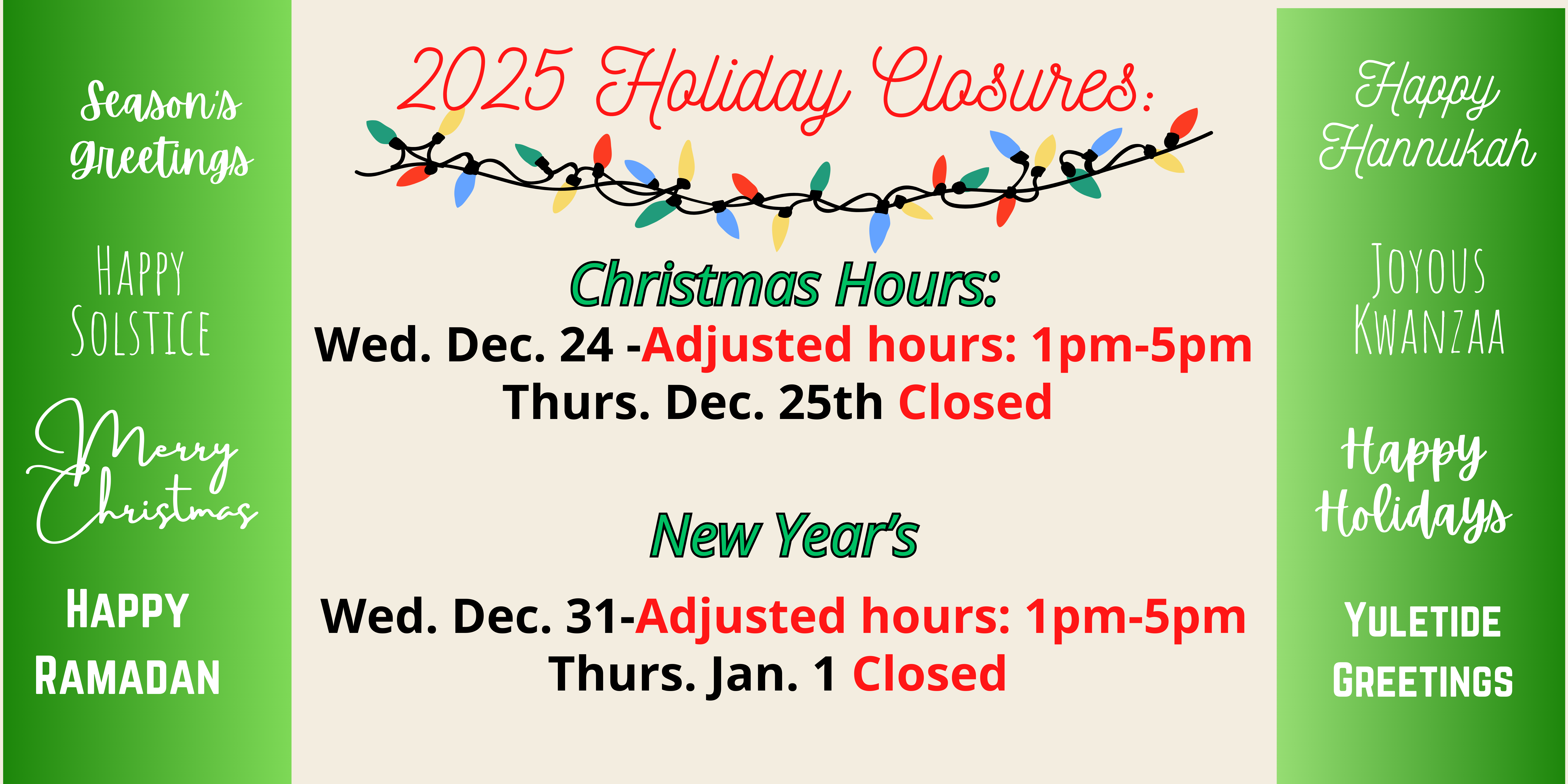 Adjusted hours for Christmas Eve and New Year's Eve: Open 1pm-5pm