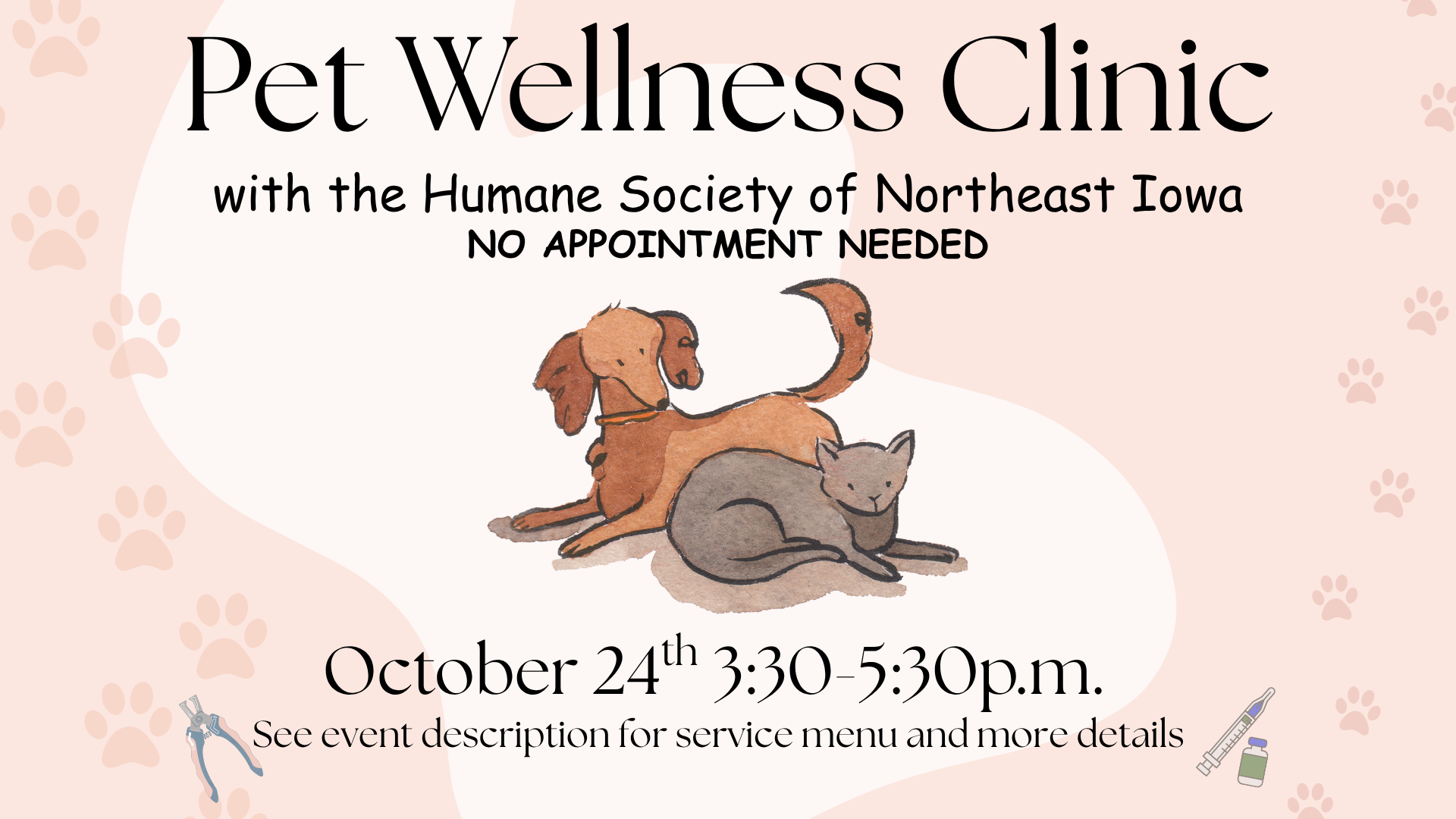 The Humane Society of Northeast Iowa is hosting a Pet Wellness Clinic at FCL. No appointment is needed. Call 563-382-0500 or email info@hsnei.org with questions.